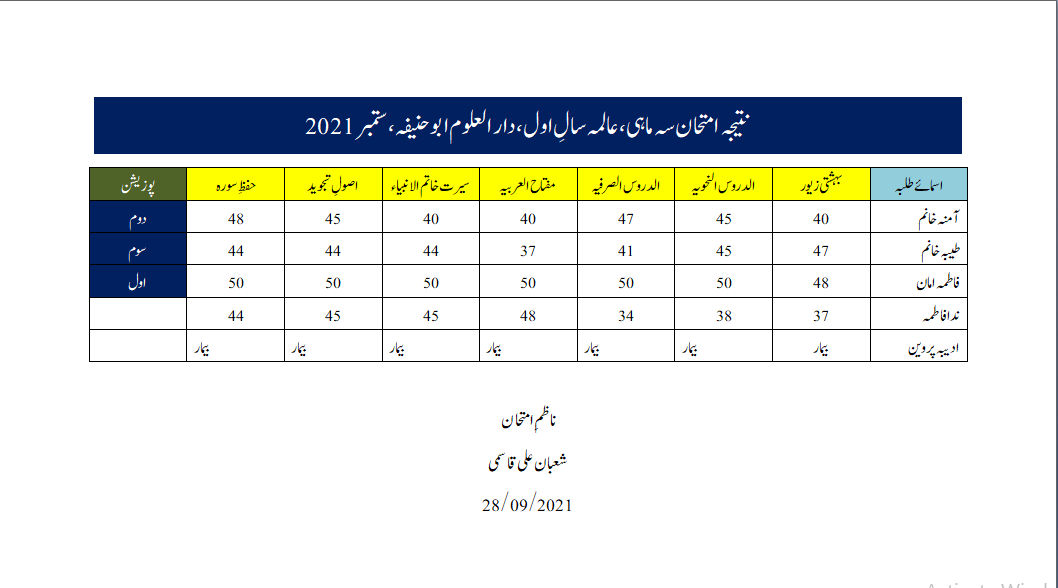 Quarterly Exam Result, Alimah 1st Year