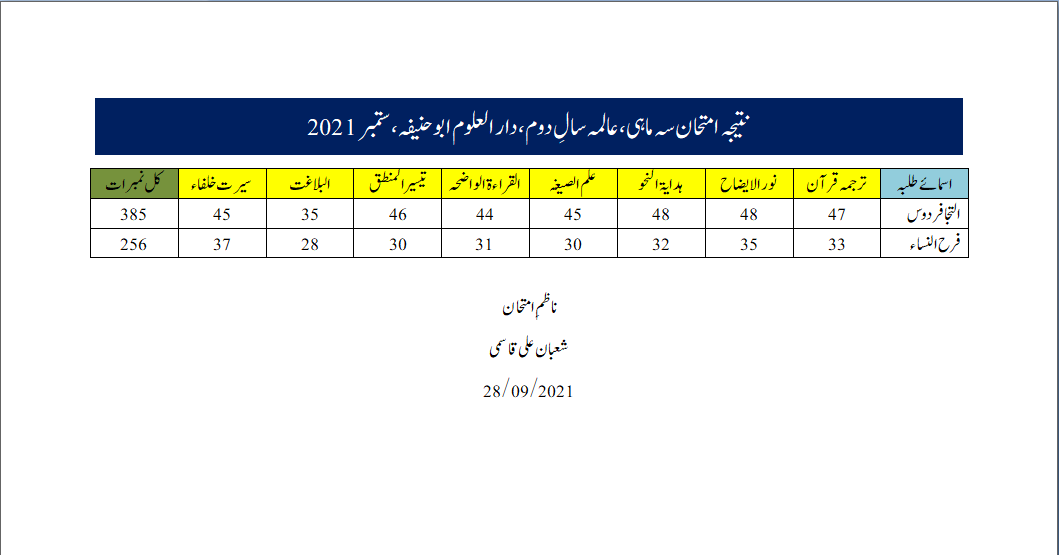 Alimah 2nd Year Alimah Course Quarterly Exam Result